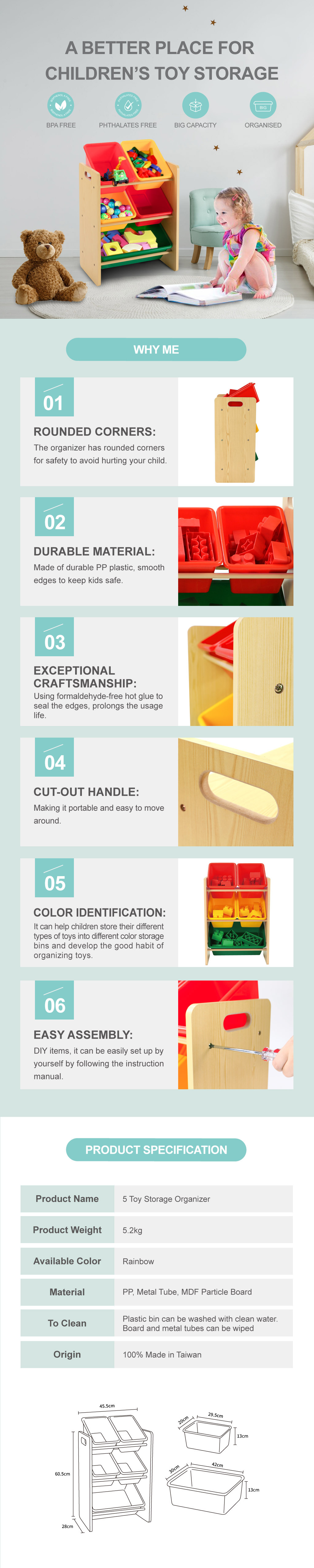 The Delsun 5 Toy Storage Organizer is made from high-density and non-toxic MDF boards which are free of Formaldehyde and complied with American ASTM Standard.