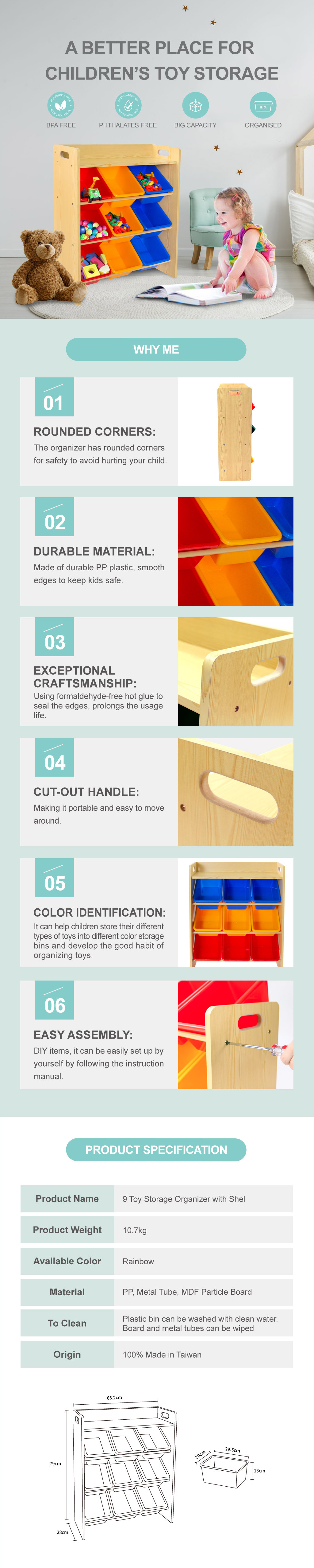 - 9 standard storage bins and wooden shelf with BPA free and phthalate free