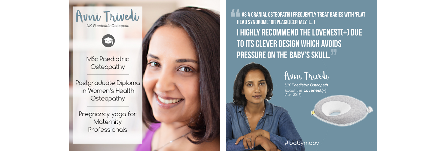 Avni Trivedi, a Paediatric Osteopath in the UK, says "As a cranial osteopath I frequently treat babies with flat head syndrome or plagiocephaly ... I highly recommend the Lovenest(+) due to its clever design which avoids pressure on the baby's skull."