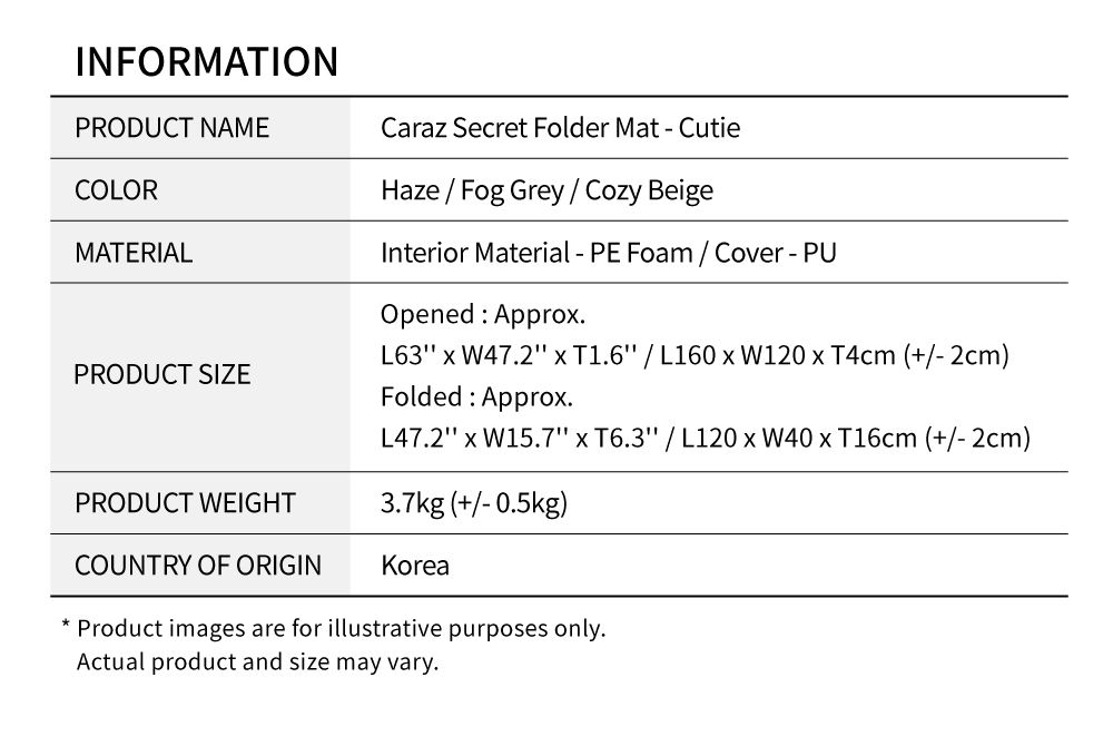 Folded Size: Approx. L47.2" x W15.7" x T6.3" / L120 x W40 x T16cm (+/- 2%)