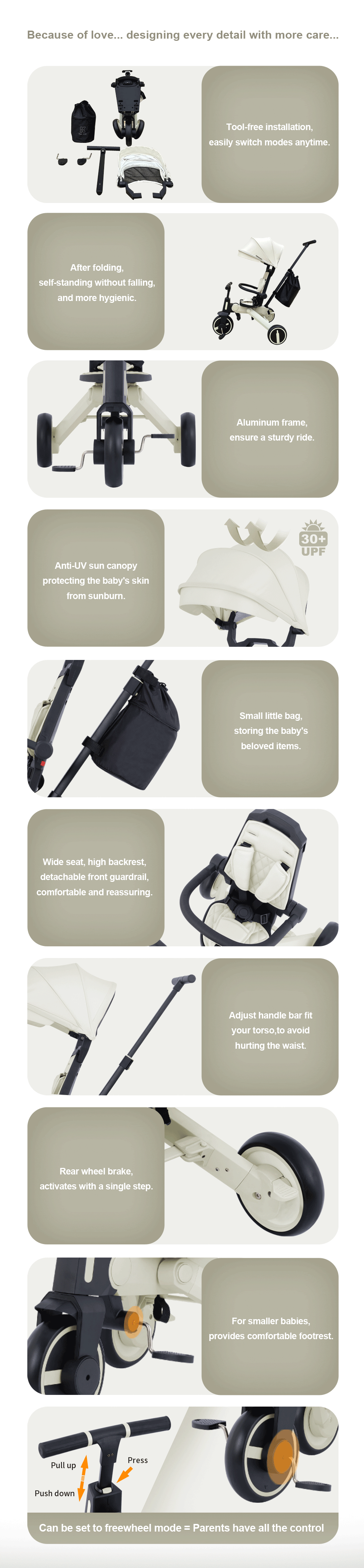 - Multi-functional Design: can be used as a stroller or trike (detachable parent handle, guard rail, hood)