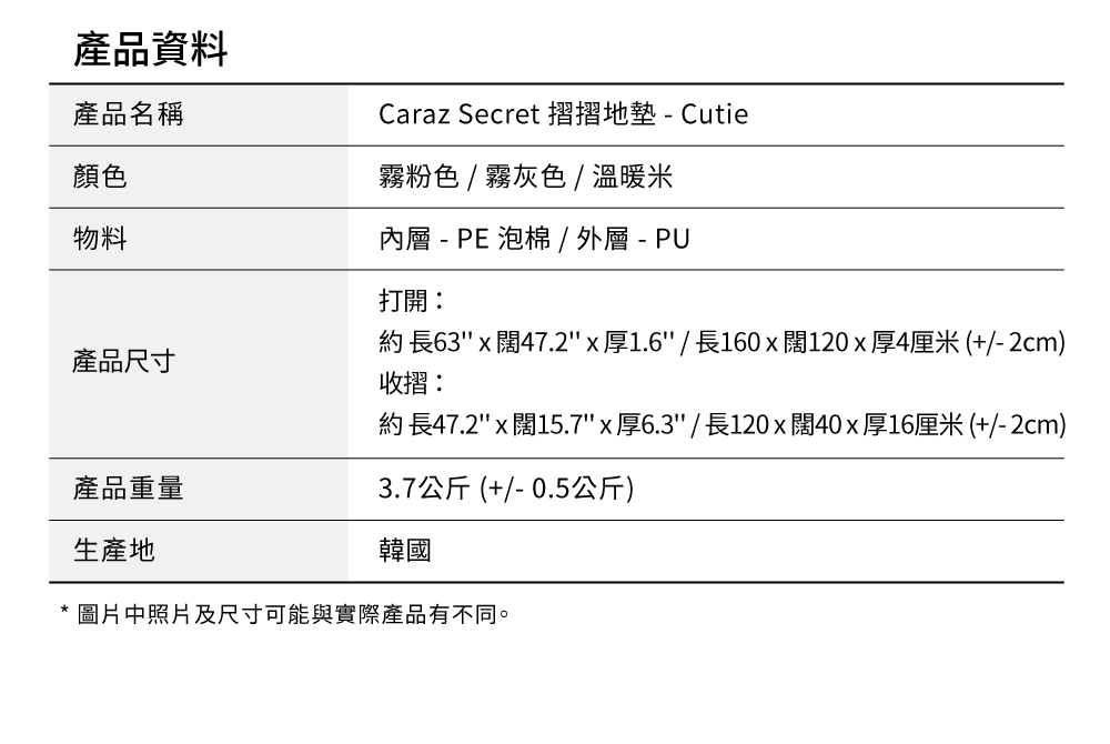 打開尺寸:約 長63” x 闊47.2” x 厚1.6” / 長160 x闊120 x厚4厘米 (+/- 2%)