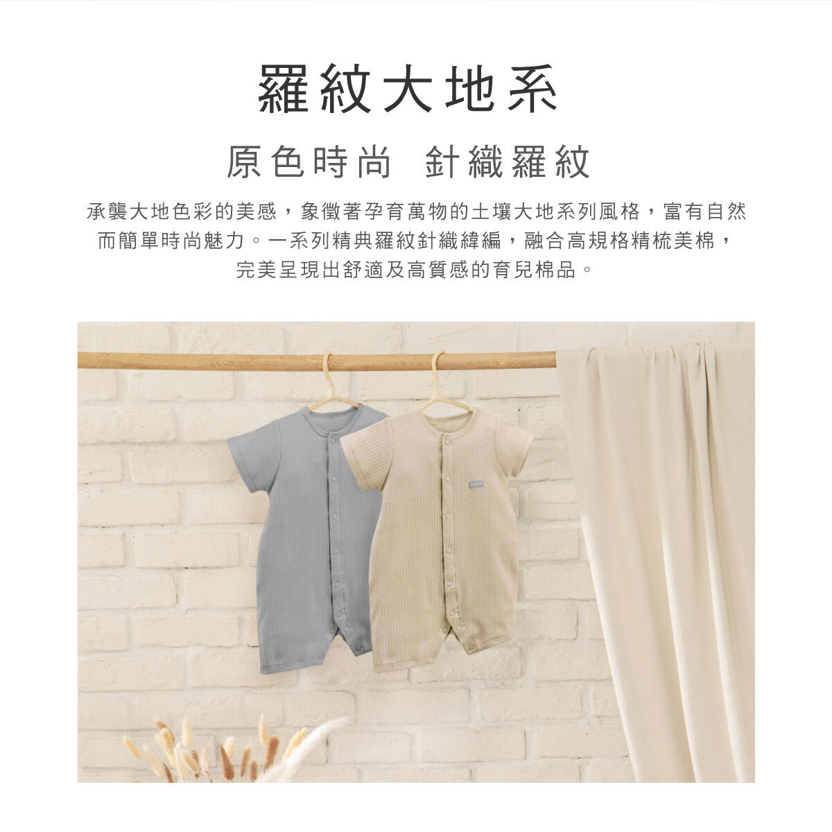 KUKU PLUS竹纖羅紋系列,以大地色羅紋針織設計,精選6x1羅紋布,以雙面緯編針織技術製成,展現出肋骨般的直線織紋。具優良延伸彈性與收縮回復性,穿著舒適且耐用,結合竹纖維與精梳棉,吸濕透氣、排汗抗臭,天然無毒並具環保認證,給寶寶舒適健康的高質感選擇。