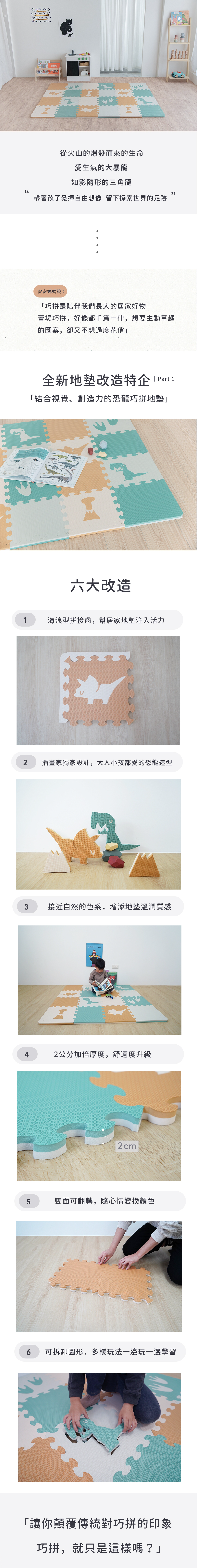 1.雙色系列巧拼地墊,淺紋路不卡髒污、改良式拼接齒,灰塵不滲透,超好清潔。