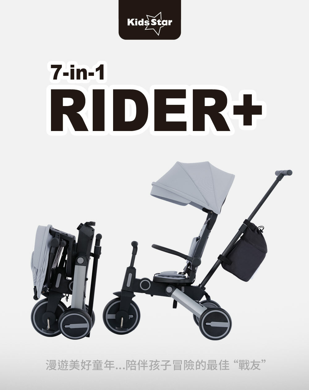 附有收摺及多功能設計的 Rider+ 三輪車,陪伴寶寶一起冒險。Kids Star 三輪車不僅可以作為嬰兒手推車,也可用作三輪車,並讓您輕鬆控制它的行走方向。它可以使用嬰兒車,變成三輪車,與孩子一同成長。