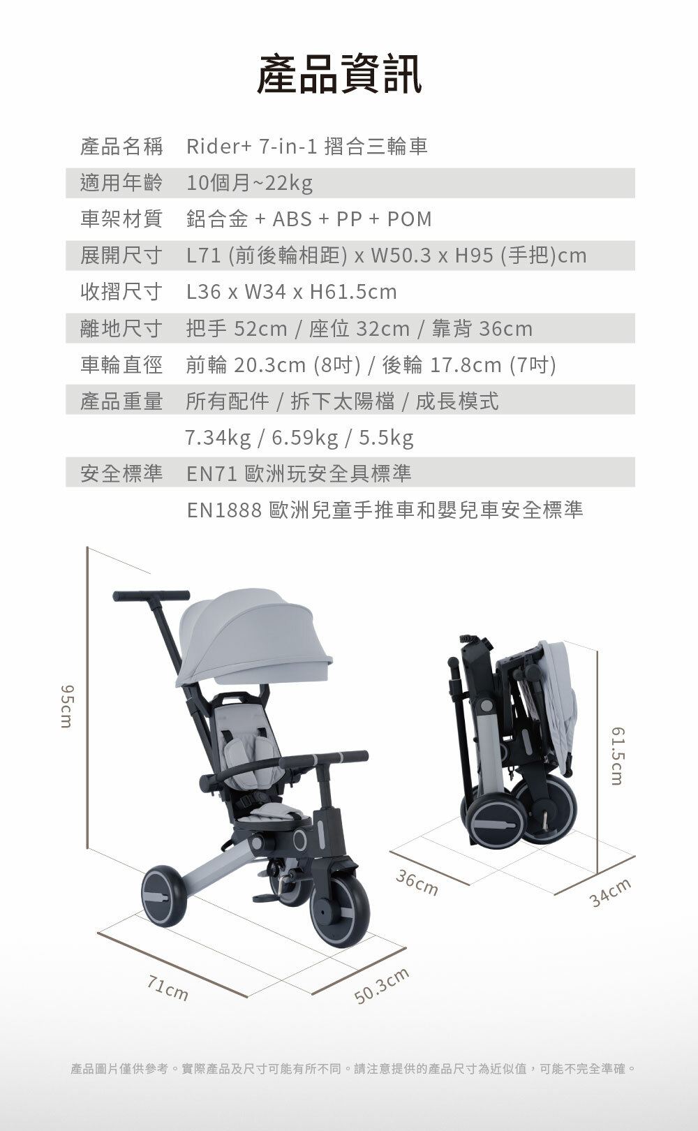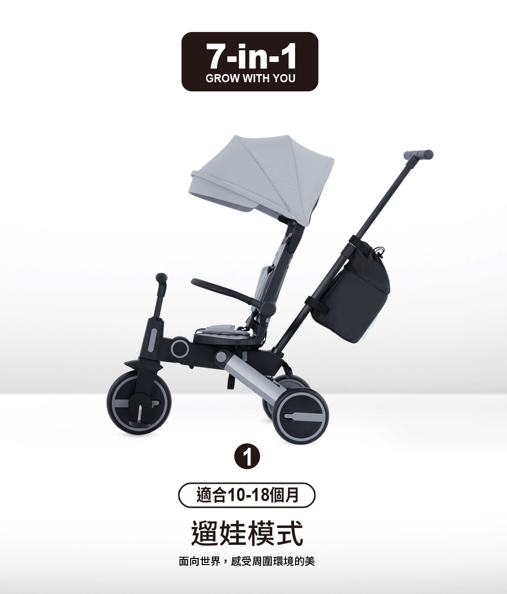 - 多功能設計:可用作嬰兒車或三輪車 (可拆式推控桿、前護欄、太陽檔)